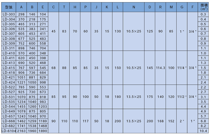 | 系列號碼 | 冷卻器外徑 | 散熱面積 | 連接型 | 用途 |