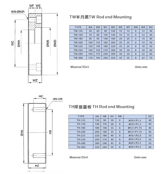 FA:前法蘭型 FB:后法蘭型 LB:腳座型 TC:耳軸型 CA:?jiǎn)味?/TD> | Y:Y型接頭 YP:Y附PIN I:I型接頭 KG:浮動(dòng)接頭 PHS:魚眼接頭 T:T型接頭 H:焊套接頭 A:可調(diào)螺帽 |