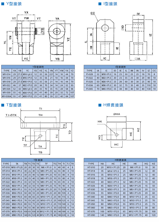 Y:Y型接頭 YP:Y附PIN I:I型接頭 KG:浮動接頭 PHS:魚眼接頭 T:T型接頭 H:焊套接頭 A:可調(diào)螺帽 |