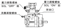 雙壓力控制型:通過切換電磁閥ON/OFF,能獲得兩種壓力補(bǔ)償型。通過設(shè)在常速的執(zhí)行器可獲得兩輸出控制。 |