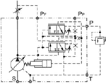 對於負載傳感調(diào)節(jié)器來講,控制壓力油來自外部。調(diào)節(jié)器有一個10bar的由店家調(diào)節(jié)的壓差。壓差可以作為主回路上的控制信號。因為調(diào)節(jié)器的壓差保持主油路的阻力不變,以此實現(xiàn)在第一條管路上對泵的流量進行調(diào)節(jié)。當(dāng)傳動轉(zhuǎn)速發(fā)生變化或負載發(fā)生波動時,在一個較寬的工作范圍內(nèi)不會影響執(zhí)行元件的速度。通過加一個節(jié)流孔(直徑為0.8mm)和一個壓力-先導(dǎo)閥可增加一個壓力調(diào)節(jié)功能。此型式為簡單式之負載傳動感。 |